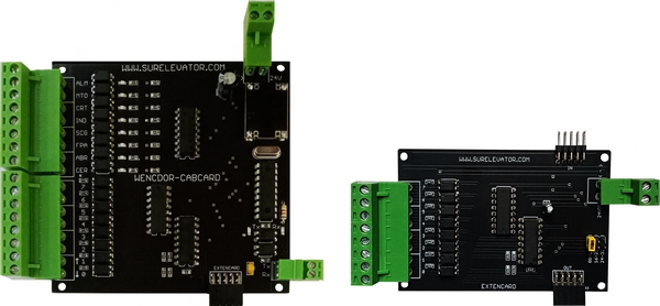 La CABCARD es una tarjeta electrónica que permite centralizar todas las llamadas de cabina y señales comando, en un paquete de datos que viajan por medio de 2 hilos del cable viajero, cuyos terminales serán conectados al borne CABINA del Controlador WENCDOR de manera directa. Este concepto permite ahorrar costos de instalación por cable viajero y simplifica el trabajo de conexión de llamadas de cabina y señales digitales.