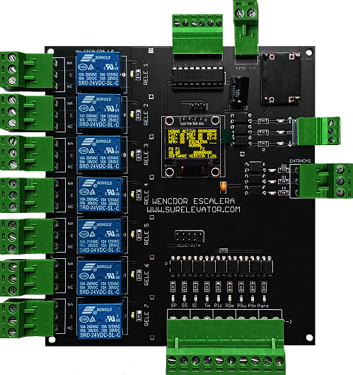 - Entradas digitales a 24VDC para lectura de: Seguridades Manuales, Seguridades superiores, Seguridades inferiores, sensores de pasamanos, sensores de peldaños, Temperatura del Motor, Detector de personas y volante del motor.